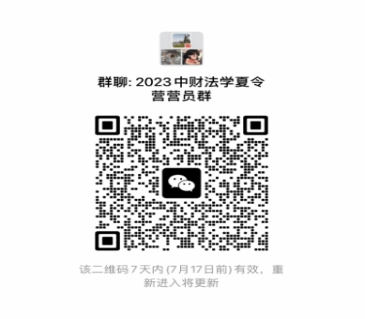中央财经大学2023年卓越财经法治人才夏令营活动日程如下,请获得营员资格的同学及时扫码入群,以有效获取相关通知。